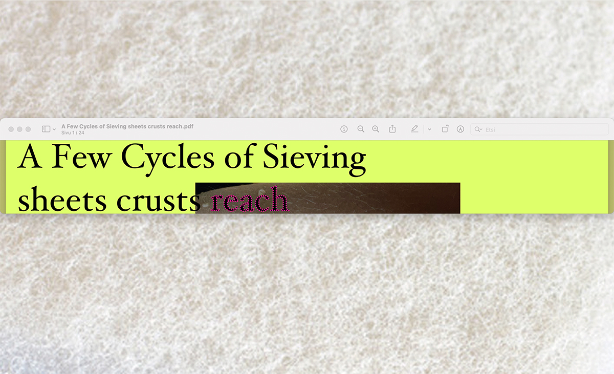 in group exhibition: Survival Kit 15: Measures curator: Jussi Koitela Latvian Centre of Contemporary Art (LCCA) Riga (LV) 2024 the work was accompanied by two reading events of Jaana's essay A Few Cycles of Sieving sheets crusts reach (2024) < back |